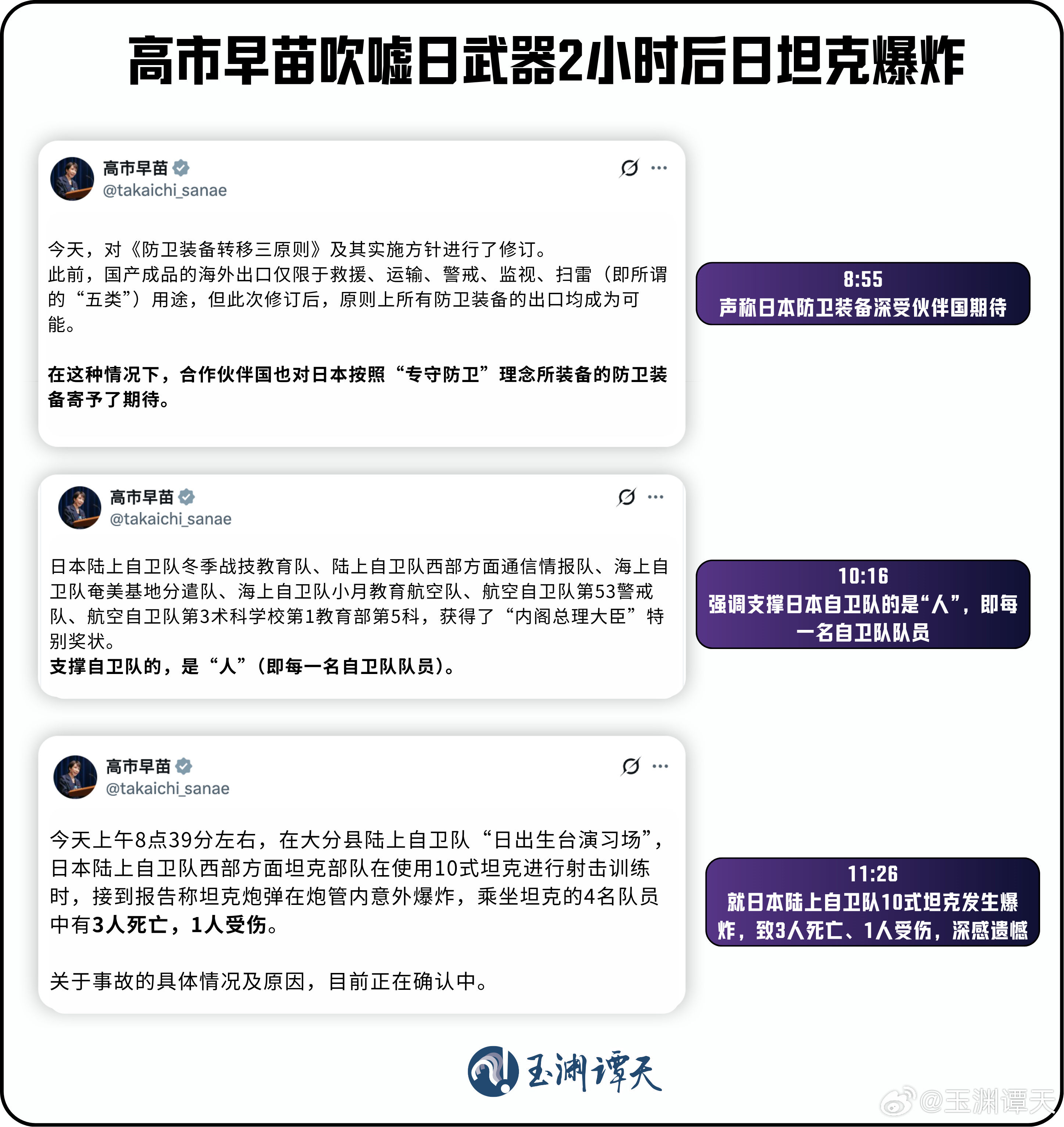 11时26分,高市早苗紧急发布消息,就日本陆上自卫队10式坦克训练时发生弹药爆炸事故深表遗憾。爆炸导致自卫队员3死1伤。高市早苗口口声声说“人很重要”,结果她吹嘘的日本武器,恰恰导致了她所在意的“人”死亡。